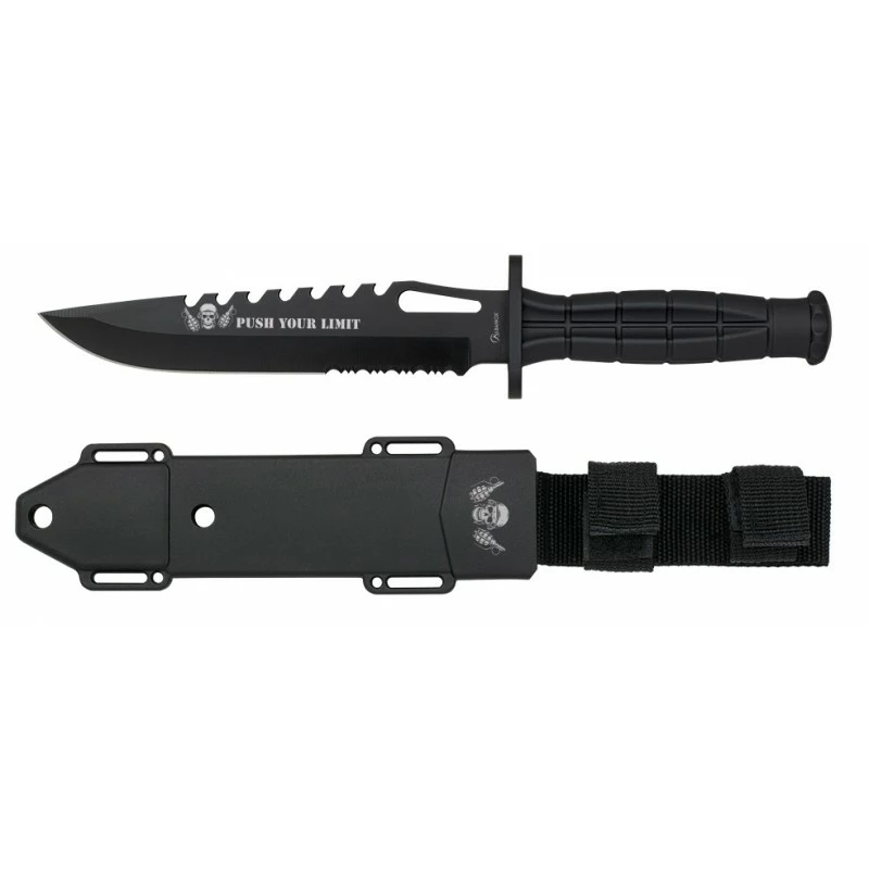 Le couteau tactique fait partie des accessoires indispensables à emporter lors d’un stage de survie ou d’une mission. Le 32568 de chez Albainox est entièrement noir, avec un look agressif sublimé par des illustrations représentant une tête de mort entre deux grenades et un texte « Push your limit », autrement dit repousse tes limites. D’une longueur de 18 cm, sa solide lame en acier inoxydable 3Cr13Mov est pourvue d’un tranchant lisse et cranté et d’un dos équivalent à une scie : une association qui offre une grande polyvalence d’usage. Ce poignard est muni d’un manche ergonomique en ABS pour une meilleure prise en main et adhérence. Entre la poignée et la lame se trouve une garde permettant de garantir la sécurité de l’utilisateur lors de la manipulation. Le fabricant espagnol inclus avec le couteau de survie 32568, un étui rigide en abs/nylon adapté pour un port à la ceinture et à la cuisse. L’ensemble vous sera livré dans une boîte de présentation.