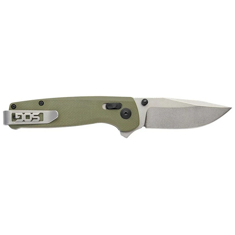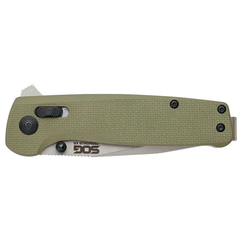 Ce modèle SGTM1022 correspond Ă la version vert olive du couteau Terminux XR de chez SOG. Le manche du couteau est en effet ici conçu en G10 coloris olive, ce qui ne manque pas d’apporter une note colorĂ©e que vous apprĂ©cierez très certainement. En plus d’ĂŞtre attrayant visuellement, le manche intègre un clip rĂ©versible qui fait en sorte que le transport du couteau ne soit jamais un problème. Le SOG Terminus XR vert olive est un EDC qui vous accompagnera durant toutes vos aventures. La lame de 75mm est fabriquĂ©e en acier D2, elle intègre une finition stonewashed dĂ©lavĂ©e pierre des plus Ă©lĂ©gantes, et pratique pour masquer les rayures quotidiennes. MarquĂ©e par l’inscription SOG Terminus XR, elle se personnalise par gravure et s’utilise de façon ambidextre. Avec ouverture XR, trou pour le pouce, kick, disponible en d’autres coloris pour le manche.