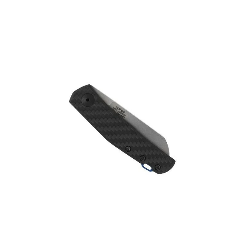 Le Zero Tolerance 0230, par Jens Anso, est un couteau pliant possédant une poignée noire en fibre de carbone, avec entretoise en aluminium anodisé bleu. Voilà qui explique pourquoi ce couteau est si léger, et donc si facilement transportable ! On peut d’ailleurs remarquer une attache lanière intégrée, coloris bleu, permettant d’attacher/accrocher le couteau ZT 0230 à l’aide de ficelle ou de corde par exemple. Un couteau au design simple mais efficace, aux performances extraordinaires ! Longueur du manche en position fermée : 95mm.