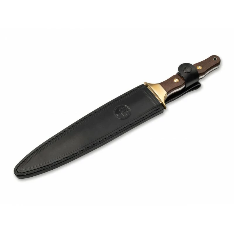Avec sa grande lame d’environ 25cm de longueur en acier ACX 390, le Böker Colmillo Guayacan impressionne tout le monde, y compris les chasseurs les plus expérimentés. Très robuste par sa construction pleine soie, la lame bénéficie d’une finition satinée ainsi qu’un double tranchant : ce pourquoi on parle alors de dague. On notera également la présence d’un protège-main en maillechort qui augmente la sécurité durant les utilisations.
