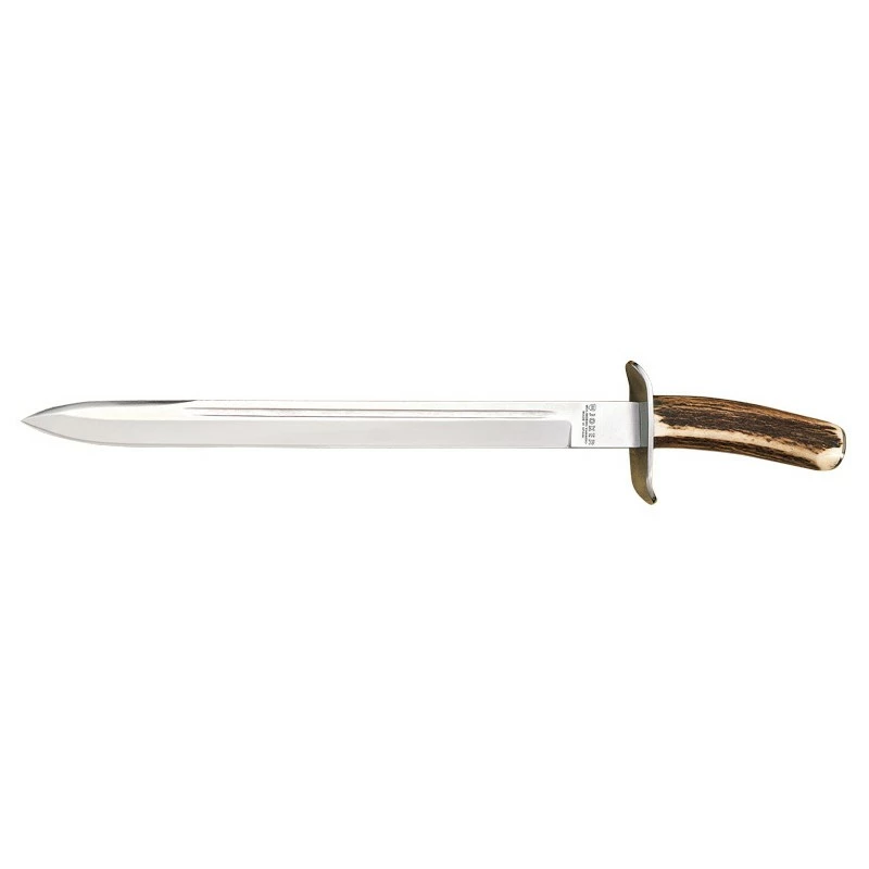 FabriquĂ©e en Espagne par la coutellerie Joker, cette dague (rĂ©fĂ©rence JK30CC) se rĂ©vĂ©lera ĂŞtre particulièrement efficace pour la chasse. Le chasseur pourra notamment toujours compter sur une grande lame de 33cm conçue en acier molybdène vanadium favorisant la soliditĂ© ainsi que la rĂ©sistance Ă la corrosion. La grandeur de la lame confère une puissance de coupe idĂ©ale pour les activitĂ©s sportives comme la chasse. Le petit plus du site le-couteau.com, c’est de vous permettre de personnaliser la lame par procĂ©dĂ© gravure (texte au choix tel que le nom du chasseur par exemple). Une fois personnalisĂ©e, la dague Joker JK30CC se rĂ©vèle ĂŞtre le parfait cadeau Ă offrir Ă un ami chasseur. La lame est de profil spear point et de type fixe avec garde. Le manche lui, est lĂ©gèrement courbĂ© pour une prise en main plus confortable, et fabriquĂ© en bois de cerf naturel (longueur 125mm). Pratique, la dague de chasse Joker 30CC vous sera livrĂ©e avec son Ă©tui en cuir marquĂ© par le logo de la coutellerie Espagnole.