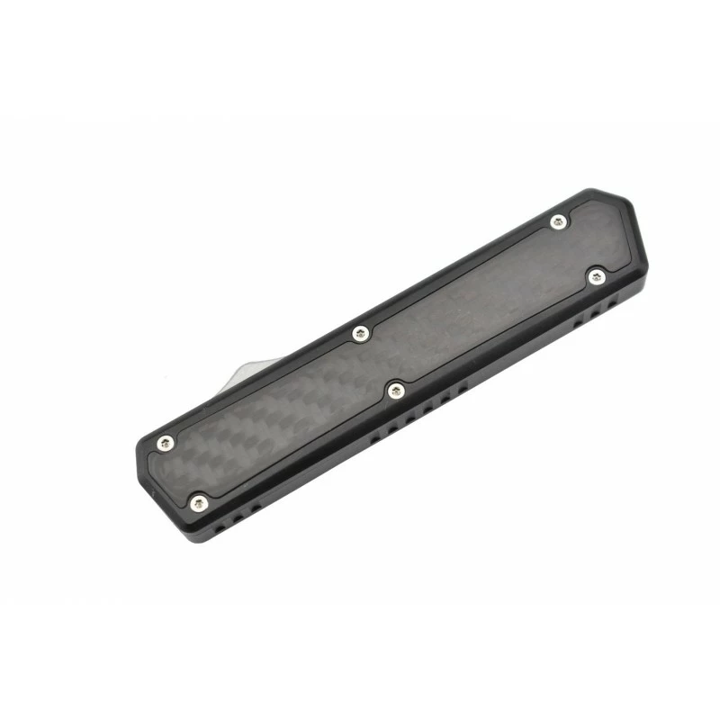Le Golgoth G6FC est un couteau automatique OTF doté d’une lame de forme tanto, mesurant 78mm de longueur, fabriquée en acier D2, avec en guise de décoration, le logo Golgoth. Possédant une dureté de l’ordre de 60HRC, la lame est à personnaliser au niveau des deux faces, par procédé gravure. Elle est éjectée de façon automatique, par l’avant, sous la commande d’un bouton poussoir situé au niveau du manche. D’ailleurs, à ce sujet, parlons un peu de la poignée du couteau automatique OTF Golgoth G6FC. Elle est composée d’un insert en fibre de carbone, à l’origine de son design si attrayant, si stylé. Le manche en aluminium 6061-T6, insert fibre de carbone, est également confortable à manier, ainsi que transportable à souhait grâce à son clip en acier inoxydable, particulièrement résistant à la corrosion. Une très belle réalisation, sans fioriture, qui plaira à coup sûr à tous ceux qui adorent les couteaux automatiques de type OTF.
