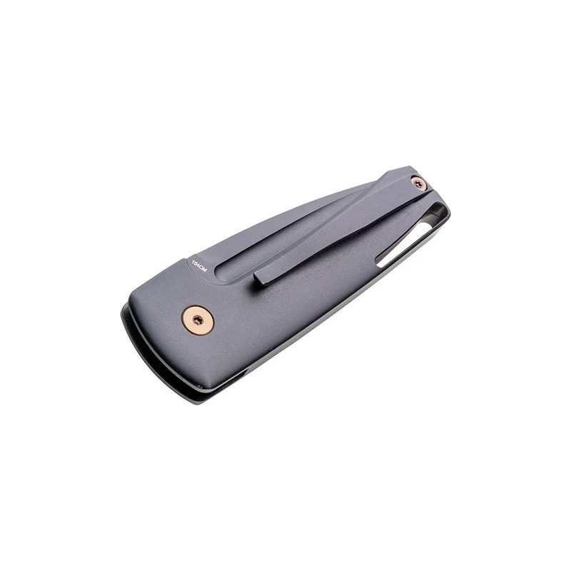 Ce mini couteau de gentleman à ouverture automatique mesure à peine plus de 7cm en position fermée. De forme inhabituelle mais pratique, la poignée noire en aluminium voit ses différents éléments (bouton d’ouverture et de verrouillage notamment) être en laiton pour une apparence des plus élégantes. Un clip de transport ainsi qu’un trou allongé en bout améliorent considérablement la transportabilité.