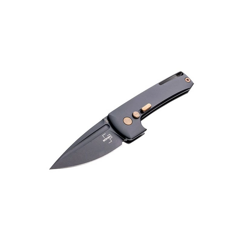 La lame du Harlock Mini Böker Plus est fabriquée en 154CM, un acier inoxydable de qualité. Également revêtue de noir, elle mesure 52mm pour une épaisseur de 2,90mm et s’ouvre de façon automatique grâce au bouton de la poignée. Possibilité de verrouillage grâce au bouton coulissant, pour éviter les ouvertures accidentelles.