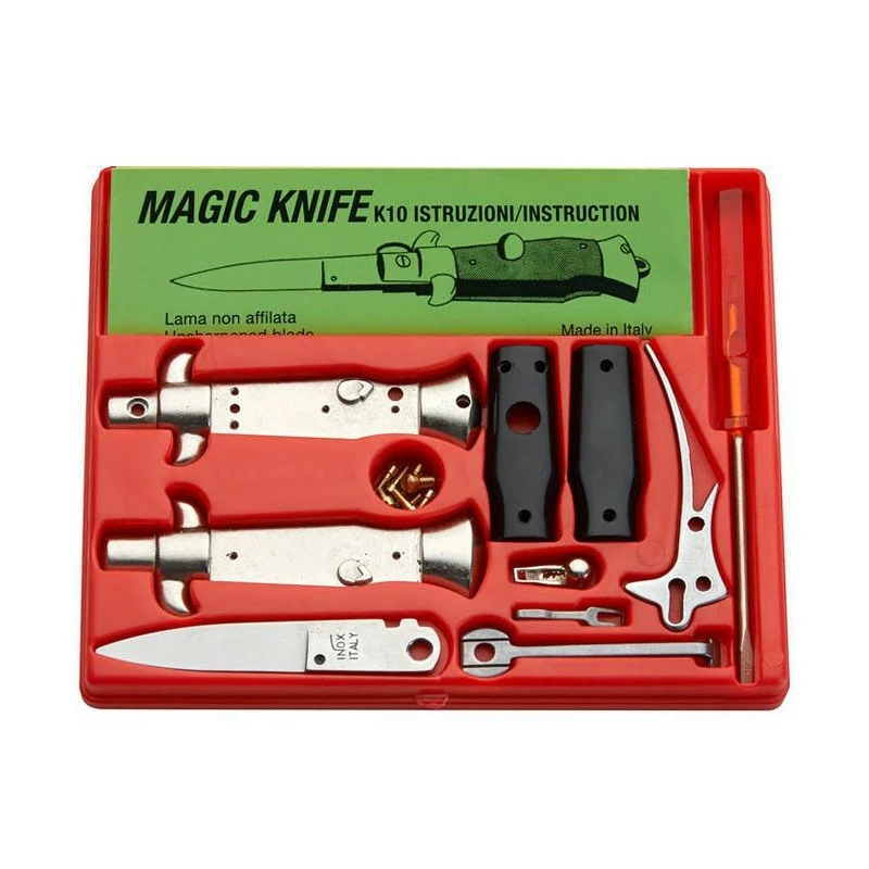 Créer les choses de ses propres mains est souvent beaucoup plus gratifiant et instructif. Ce kit d’assemblage contient tout le matériel nécessaire pour construire un mini couteau automatique. Les différentes parties à assembler sont bien rangées dans le coffret rouge afin de les distinguer facilement et donc rapidement. On observe par exemple les poignées pour le manche, les vis, le tournevis et bien sûr la lame qui n’est pas coupante car non affûtée. Après l’effort, place au réconfort avec un mini couteau automatique pleinement fonctionnel, pour information, il mesure 58mm de long en position fermée. Un kit d’assemblage parfait pour comprendre le fonctionnement du couteau automatique ! Fabrication Italienne.