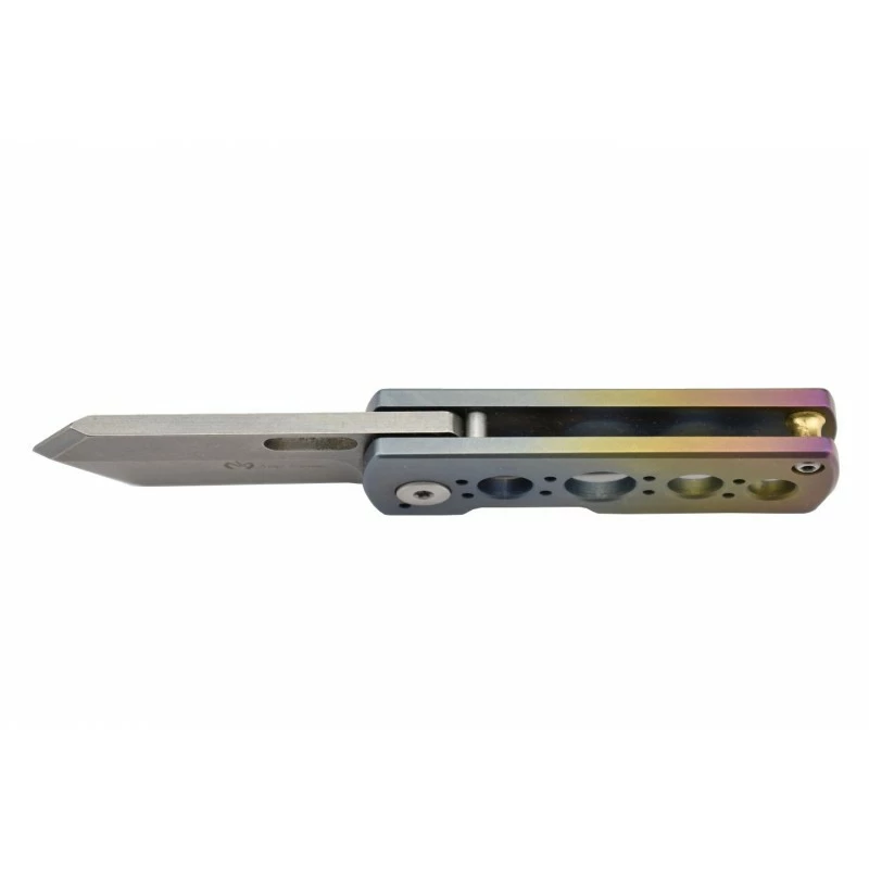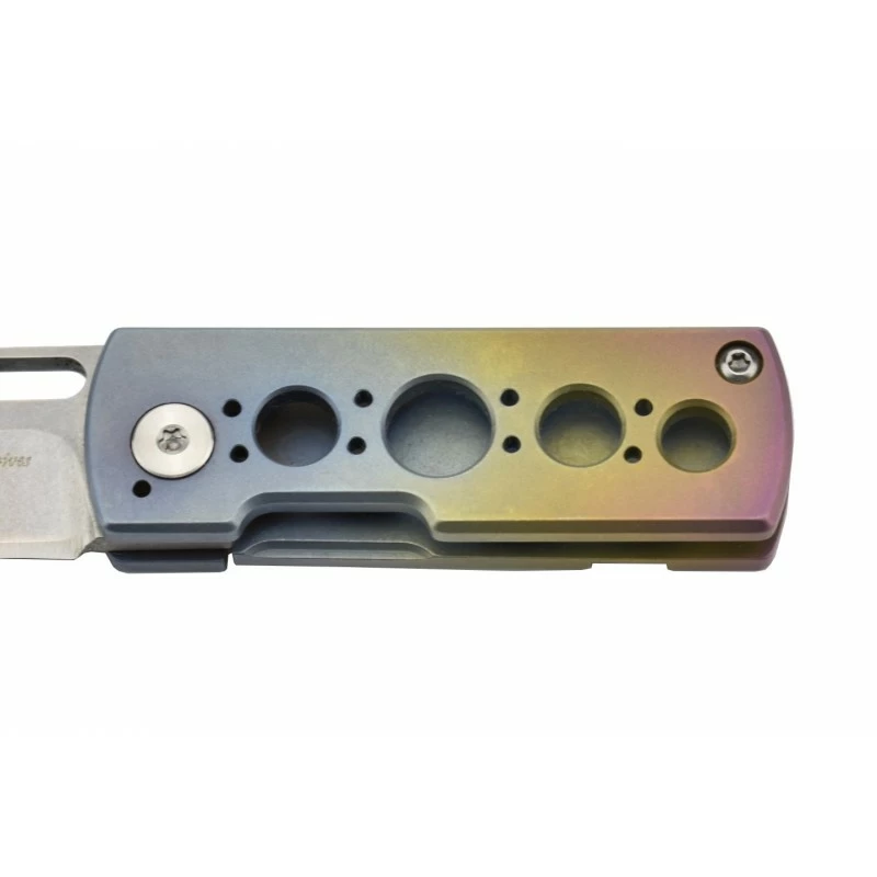 Ce modèle MK150, signé Max Knives, est un mini couteau pliant, facilement transportable au quotidien. Il est vrai que son manche de 6cm de long permet de le ranger n’importe où, même dans une petite poche. Ainsi il sera en permanence à vos côtés, sans que vous le sachiez ! La poignée est conçue en titane anodisé, ajourée à multiples reprises par des ronds de tailles diverses, elle comprend plusieurs nuances de couleurs pour un effet très stylé, très design. On mentionnera qu’ici, le verrouillage de lame est de type frame lock.