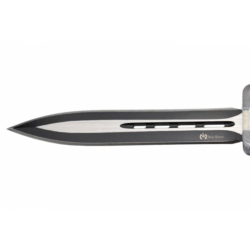 Relativement simple Ă transporter en raison de sa longueur de 13cm en position fermĂ©e, le couteau automatique OTF Max Knives MKO23DEC se dote Ă©galement d’une lame Ă double tranchant, fabriquĂ©e en acier 3Cr13MoV. Une lame pointue, ajourĂ©e avec finesse et Ă©lĂ©gance, grise avec revĂŞtement noir, qui ne manque ni de style, ni de tranchant ! Longueur de la lame : 85mm.