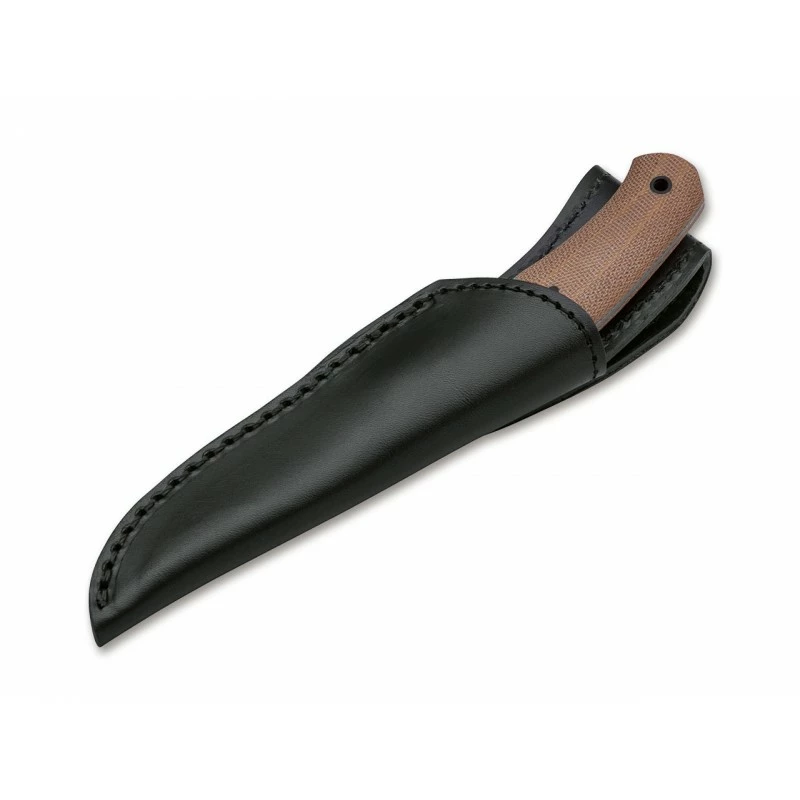 Le Boxer Fixed 120503, par Böker, est un poignard conçu par le coutelier Français Raphael Durand, localisé dans le bassin Thiernois. Son expérience et son savoir-faire ont permis de concevoir un couteau fixe de très haute qualité, doté d’un manche en micarta marron, une couleur qui va s’assombrir avec le temps. Un phénomène tout à fait normal, lié à l’action des rayons UV. La poignée en micarta mesure précisément 111mm de longueur, si bien qu’elle tient aisément dans la main. Avec trou pour lanière en bout. Qui plus est, un étui en cuir noir (voir les images) permet de protéger le poignard Boxer Fixed 120503 avec beaucoup de style, d’élégance. De forme clip point, la lame de 84mm est fabriquée en acier N690, avec effet stonewashed : son épaisseur est de 2,9mm. La lame est notamment décorée par le logo Böker Solingen, de quoi faire les beaux jours de tous les fans de la marque Allemande à la renommée internationale, mondiale.