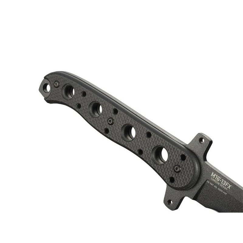 Le poignard M16-13FX CRKT possède un manche en G10 noir conçu pour adhérer en toutes conditions, même par temps humide par exemple. Série M16 oblige, ce même manche est ajouré par plusieurs trous de forme arrondie. Le poignard est livré avec un étui en nylon et fibre de verre afin d’assurer une protection efficace. Ce dernier a des trous pour pouvoir être fixé sur une ceinture, un sac et autres supports …
