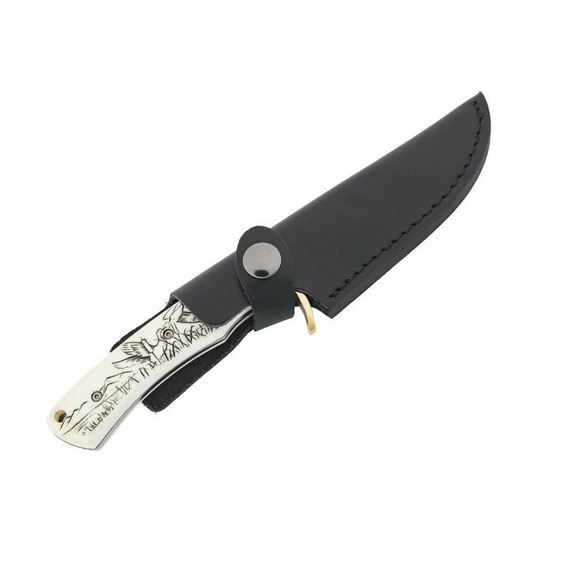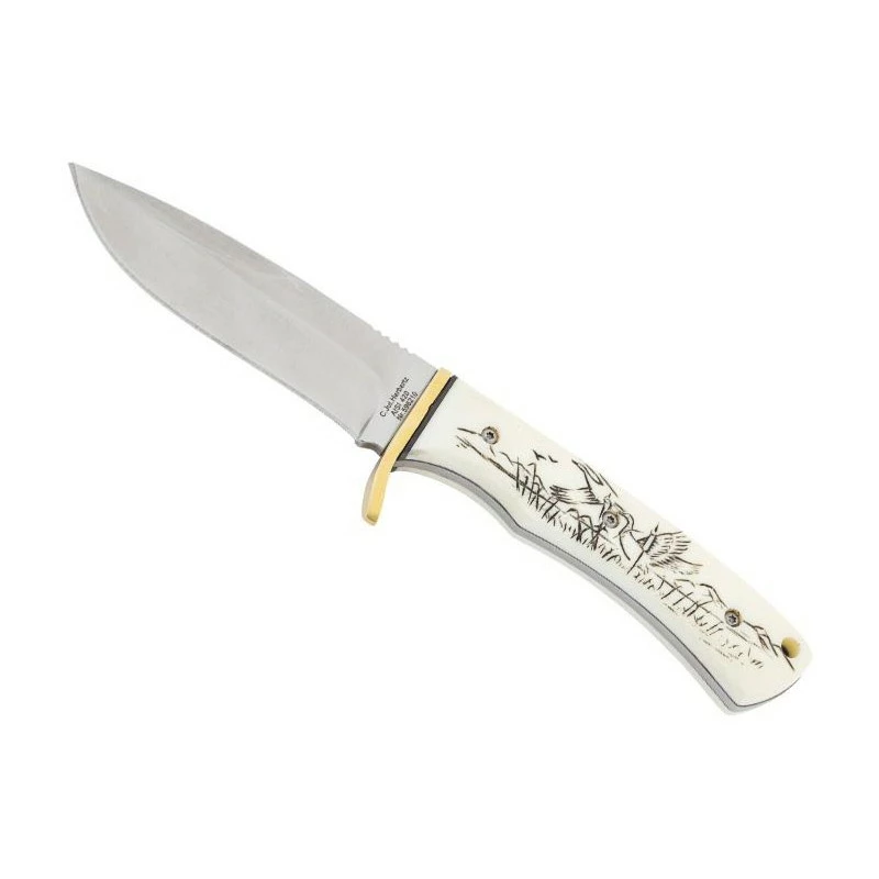 Ce modèle Herbertz 596210 est un poignard de chasse vendu Ă un tarif attractif. Il est muni d’une poignĂ©e faite de matĂ©riau plastique imitant l’ivoire, il s’agit d’ivoirine. Ce mĂŞme manche est dĂ©corĂ© d’un motif canard façon scrimshaw, une technique artisanale très prisĂ©e des chasseurs dans l’ancien temps. Procurant un grand confort de prise en main, la poignĂ©e est aussi Ă l’origine d’une excellente transportabilitĂ© via le trou pour cordon. Le poignard Herbertz possède une lame pleine soie mesurant 10cm de longueur, avec une fabrication en acier inoxydable 420. Une garde de sĂ©curitĂ© en laiton dorĂ© fait en sorte que la main ne vienne pas glisser pendant l’usage, une sĂ©curitĂ© Ă toute Ă©preuve. Ce couteau de chasse Ă lame fixe est livrĂ© avec son Ă©tui en cuir noir dont la fermeture se rĂ©alise par bouton pression. Existe aussi avec dĂ©coration cerf.