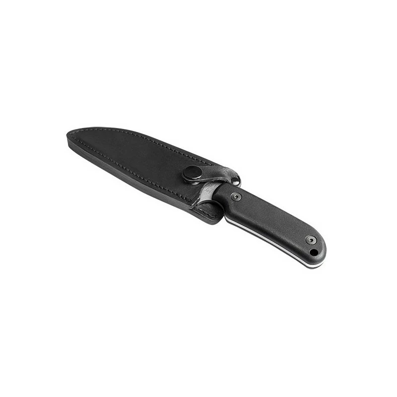 Le manche du poignard a une surface lisse en G10 noir, matériau composite moderne alliant de la fibre de verre à de la résine. Il combine légèreté et robustesse, toutes les qualités requises pour faire office de bon revêtement pour la poignée d’un couteau ! Un passe-lacet est présent au niveau de l’extrémité du manche.