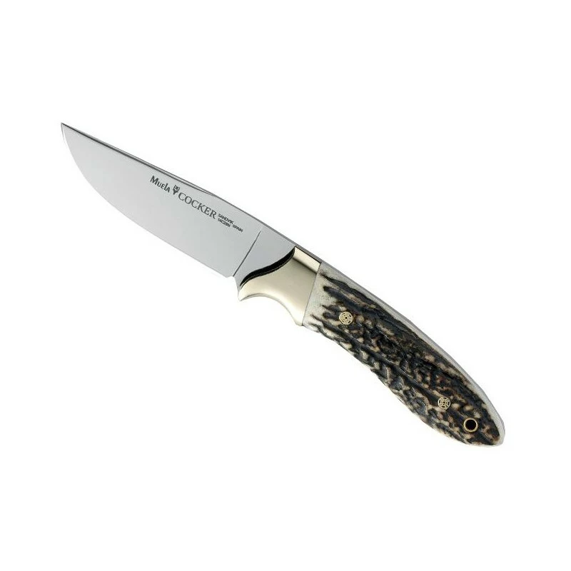 Le Muela Cocker 9293 est un poignard qui ne passera pas inaperçu de part son manche fabriqué en bois de cerf véritable avec vis mosaïque. En plus d’être solide, le manche est aussi très esthétique avec un design très authentique. Le plus incroyable dans tout cela, c’est que la prise en main du poignard reste tout de même très confortable, même en cas d’utilisations intensives. À noter que le bois de cerf véritable est un matériau très apprécié des chasseurs. Le poignard Muela Cocker dispose aussi d’une lame de longueur 11cm fabriquée en acier 14C28N (lame de haute dureté et de bonne résistance à la corrosion). On peut d’ailleurs apercevoir sur la lame le nom du poignard, ici le Cocker, accompagné du logo Muela. Le pays de fabrication est aussi mentionné par l’intermédiaire du « Made in Spain » indiquant une fabrication Espagnole. Rappelez-vous que la lame du poignard Muela Cocker 9293 est soumise à la personnalisation au niveau des deux faces (procédé gravure). Comme très souvent, ce modèle est vendu avec son étui de protection en cuir Muela (voir photos du produit pour aperçu).
