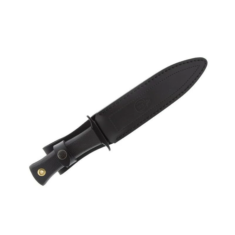 Le Muela ESCORP référence 9311 dans sa version « totalement noire« . Ce poignard se dote d’une lame noire fabriquée en acier inoxydable 420, elle mesure 19cm de longueur. Une longue lame tranchante qui ne craint pas l’usure grâce à son excellente résistance face à la corrosion ou rouille. À noter qu’on peut apercevoir sur la lame noire le logo Muela (fabricant Espagnol) ainsi que le texte « ESCORP« . Le poignard Muela ESCORP 9311 intègre aussi un manche en gomme noire assurant une prise en main optimale. Grâce à la surface antidérapante du manche, la prise en main s’avère être confortable et sûre en toutes circonstances. Il faut rappeler le fait que la gomme est un matériau non conducteur du froid pour une utilisation possible du poignard en toute saison (même en hiver). Ce modèle est vendu avec son étui de protection en cuir noir Muela. Ce poignard est également disponible avec une lame plus grande de longueur 26cm (voir accessoires conseillés ci-dessous).