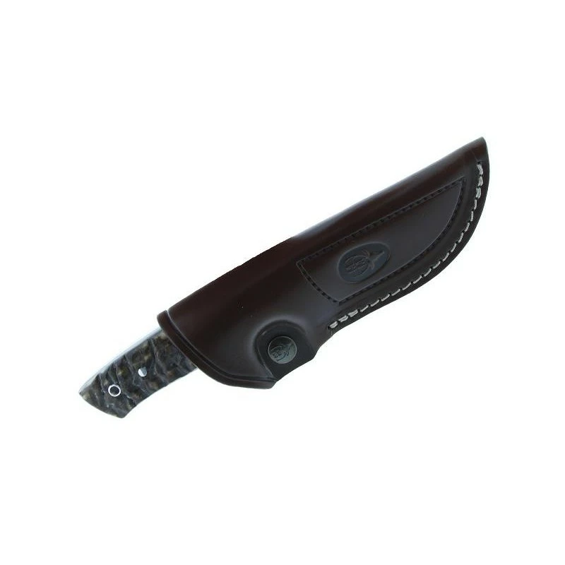 Le « Kodiak » est un poignard de chasse fabriqué en Espagne par Muela. Sa particularité, c’est son manche conçu en corne de bélier avec un effet relief des plus réussis. Un matériau d’origine animale de grande qualité qui confère au manche un caractère unique. On notera également la présence d’une mitre brillante pour assurer la protection du poignard en cas de chute. Le poignard Muela Kodiak 9280 dispose aussi d’une lame fabriquée en acier inoxydable X50CrMoV15, un acier réputé pour son tranchant à toute épreuve ainsi que pour sa résistance face à la rouille. Longueur de la lame : 10cm, elle se personnalise par gravure (voir bouton ci-dessous pour plus d’informations). Notez bien le fait que la lame est déjà marquée par le logo Muela avec juste à côté le texte Kodiak en référence au modèle du poignard. Et pour prendre soin de ce petit « bijou », vous pourrez toujours compter sur un magnifique étui de protection en cuir noir signé Muela. Pour voir concrètement à quoi il ressemble, nous vous invitons à regarder les autres images du produit.