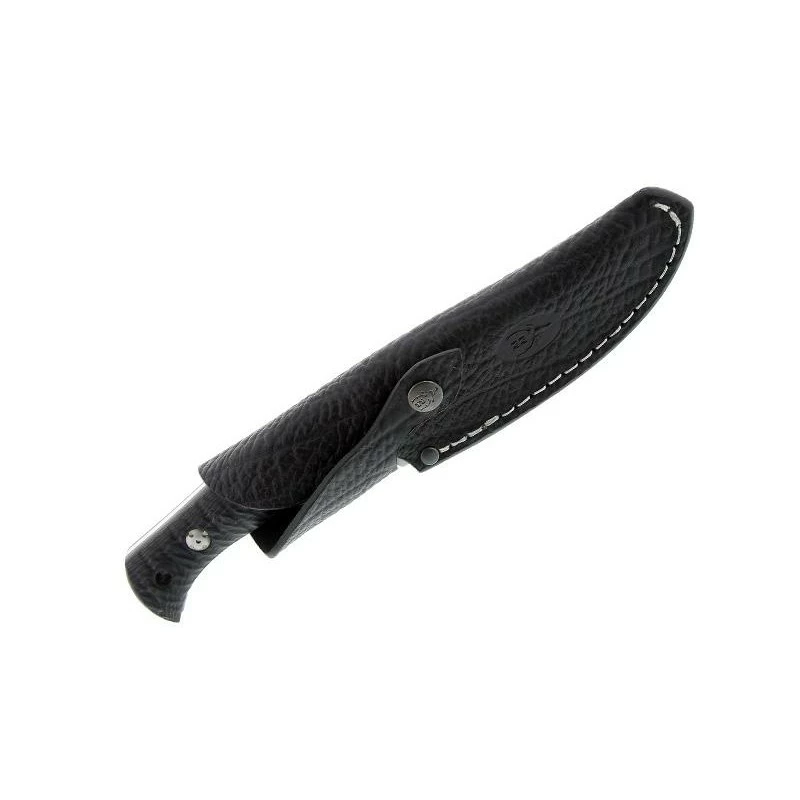 Le Muela Lakhota 9317 est un poignard doté d’une lame fixe de longueur 12cm fabriquée en acier inoxydable 1.4116. À bout pointu, la lame est décorée par le logo Lakhota mis en avant, on peut aussi apercevoir le logo Muela dans une moindre mesure. Il faut préciser le fait que Muela est le nom d’une coutellerie Espagnole spécialisée dans les couteaux et poignards pour chasseurs. N’oubliez pas que le-couteau.com vous offre la possibilité de personnaliser la lame de votre poignard Muela Lakhota 9317 au niveau des deux faces (voir bouton ajouter une gravure). Côté manche, il est fabriqué en micarta noir (papier ou coton mélangés avec de la résine) : il est extrêmement élégant tout en restant ergonomique (bonne prise en main). Un poignard Muela Lakhota qui a de l’allure, il est aussi vendu avec son étui en cuir noir, un étui de qualité toujours conçu par Muela.