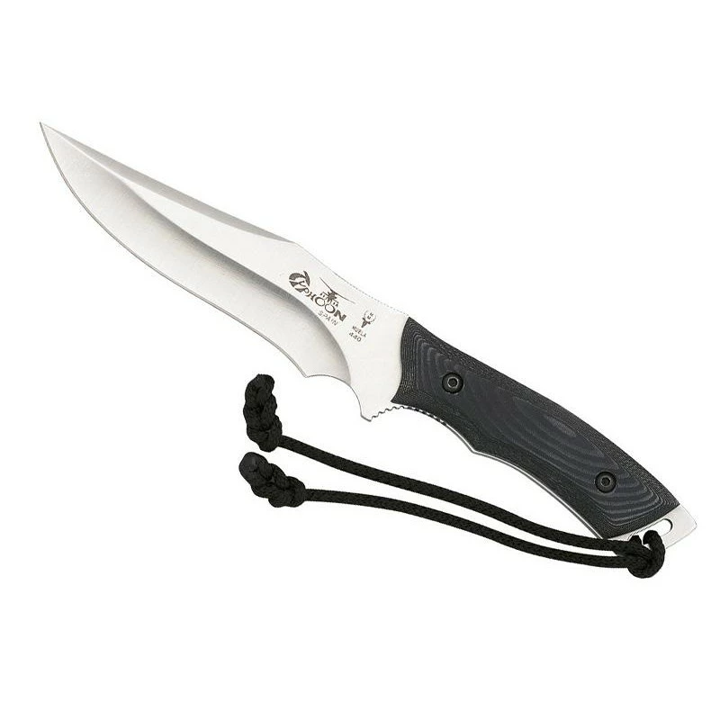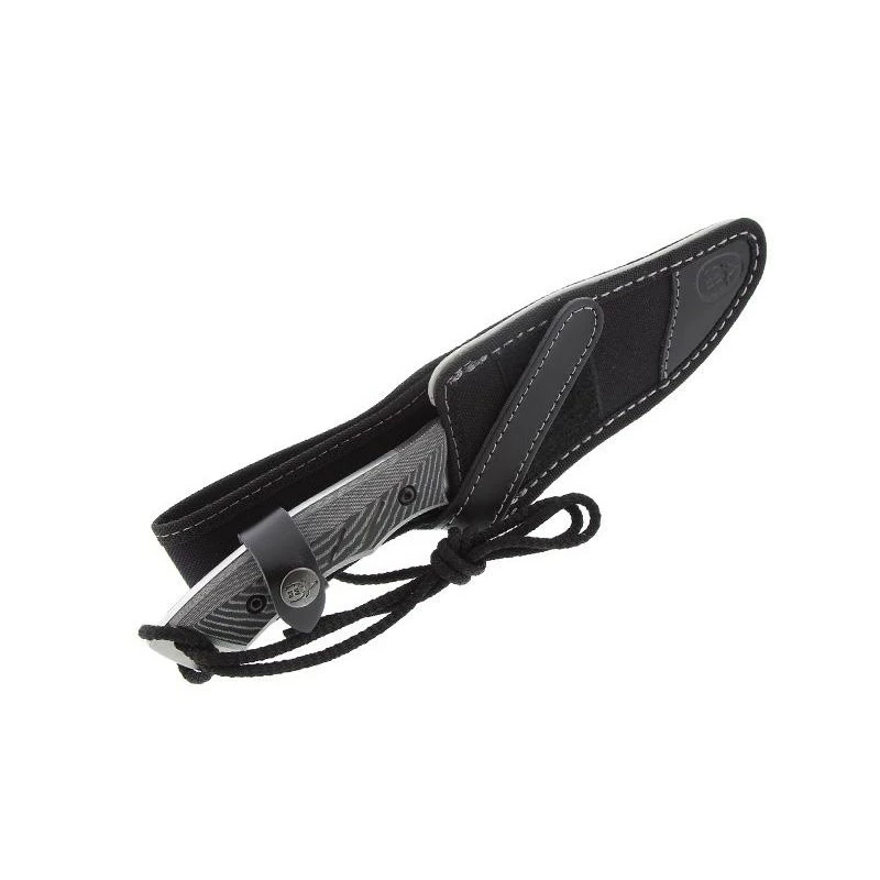 Le Muela Typhoon 9233 est un poignard facilement reconnaissable pour son manche en micarta gris veiné. Pour rappel, il s’agit d’un matériau composite à base de papier ou de coton mélangé avec de la résine. Le micarta assure une excellente robustesse au manche, une très bonne ergonomie tout en conservant un design exceptionnel. On notera également la présence d’un lacet en bout de manche permettant de pouvoir accrocher le poignard Muela Typhoon n’importe où (notamment à un sac à dos). Idéal pour les chasseurs ou fans de chasse, le poignard Muela Typhoon 9233 possède aussi une lame de 15cm en acier inoxydable. Une lame lisse décorée par le logo Typhoon ainsi que le logo Muela (Marque Espagnole d’articles de chasse). Possibilité de personnaliser la lame par gravure sur les deux faces (recto et verso, voir bouton ci-dessous). Le poignard Muela Typhoon est livré avec son étui cordura en nylon : un étui élégant qui rend le transport du poignard aisé en toutes circonstances.